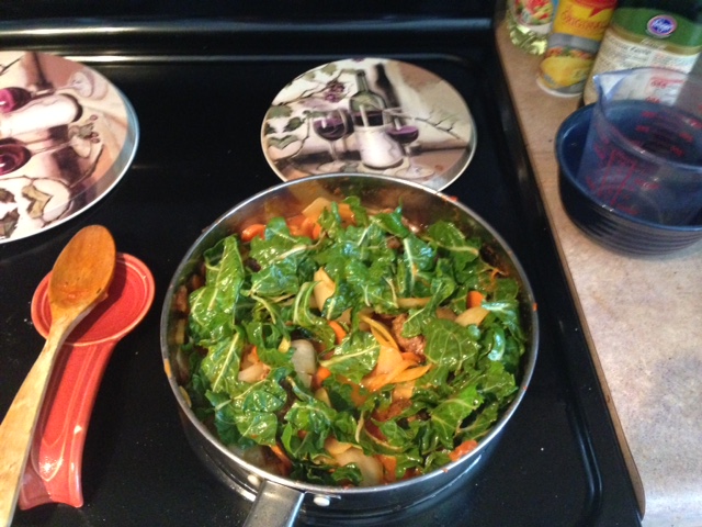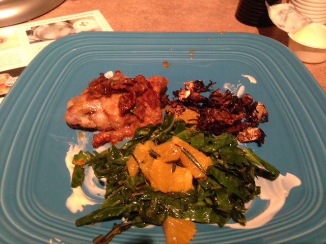 Let's talk about the biggest positive first: The rosemary-orange salad. I had never used collard greens before, but thinly sliced and cooked with orange pieces, orange zest and water in a pan that was used to brown chicken is not the worst idea ever. The "dressing" was the second half of the orange pieces, a drizzle of olive oil, fried rosemary (I know it sounds weird) and a little salt and pepper. It was great.
