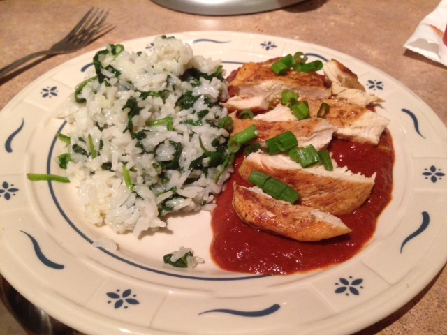 Speaking of the rice, it took a lot less time to cook than I thought it would and it just kind of sat there (and got a little bit sticky) while I was cooking the chicken and preparing the sauce. The chicken was a place where I went off recipe for a minute. I used the glass lid to my pan instead of tenting the pan with foil to speed up the cooking time. One of my chicken breasts was really thick and the other one was almost a cutlet. I had to remove the thinner one first and let it sit on the plate while the other finished cooking, and it took longer than planned.